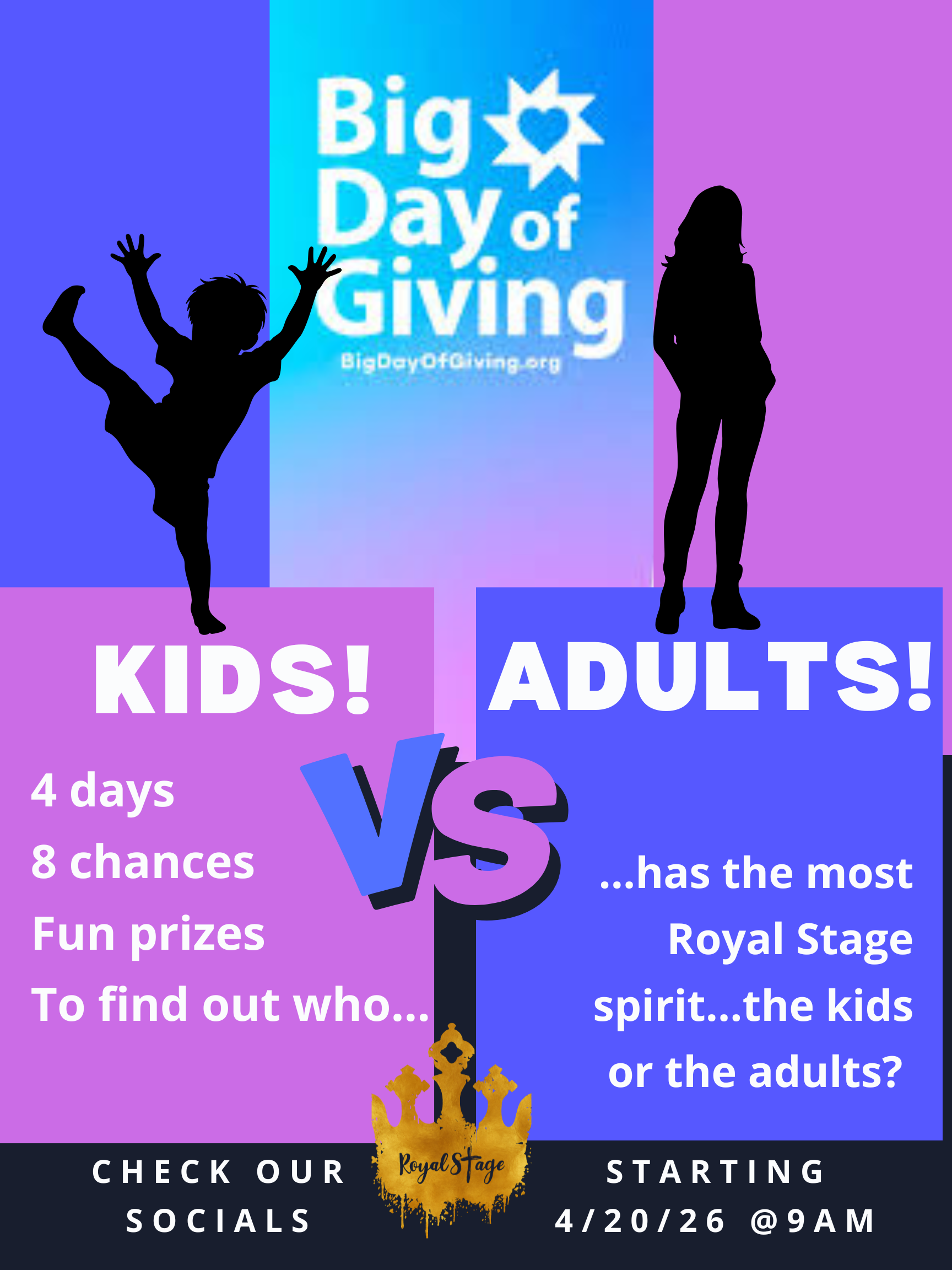 Big Day of Giving is happening on May 7, and we are giving ALL Royal Stage participants a chance to prove - who is more worthy of the spotlight? Kids or adults?